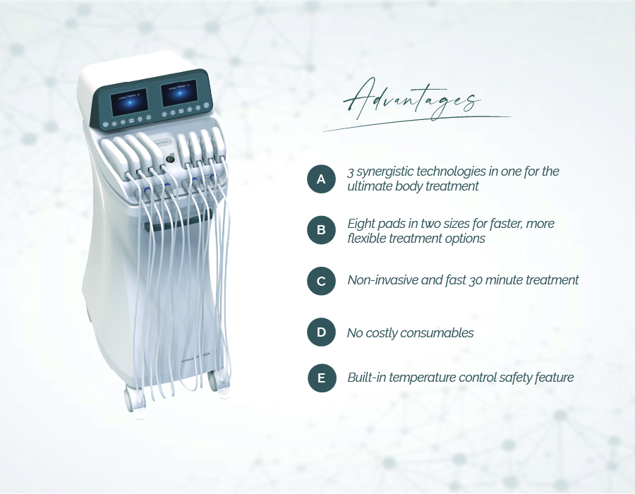 The CONTOUR TRIMAX™ combines 3 distinct technologies into 1 device – radio frequency, amplitude modulated middle frequency, and low-level laser. These technologies, when applied to the treatment site, stimulate the subcutaneous layer of the skin, transmitting beneficial effects to the body’s interior. This results in alleviating muscle and joint pain, skin tightening, and the remodeling of both skin and collagen.